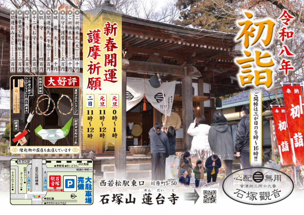 「石塚の観音さま」として親しまれる蓮台寺では、正月三ヵ日に本尊さま御開帳のうえ、元朝参りを受け付けています。ご近所の方のみならず、広く市内全域から初詣においでになられます。ロウソクのあかりの中、新年にふさわしく賑やかな護摩祈願は、西若松の風物詩となっています。